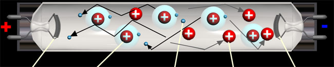 Die Röhre mit zwei eingeschmolzenen Elektroden ist mit verdünntem Gas gefüllt, und eine Gleichspannung wirkt auf die in jedem Gas vorhandenen freien Elektronen ein. Die freien Elektronen (negativ) wandern zur positiven Elektrode, während sich die Ionen (positiv) zum negativen Pol der Röhre bewegen. Auf diesem Wege stoßen die Elektronen mit den Gasatomen zusammen und ändern dabei ihre Richtung, so dass sie auf zickzackförmigen Weg ihr Ziel erreichen werden. Der Zusammenstoß der Elektronen mit Atomen ist für die Erzeugung des lichtes notwendig. Nach der Größe der Stoßgeschwindigkeit lassen sich drei Fälle unterscheiden, die in einer Gasentladungslampe möglich sind: >>>