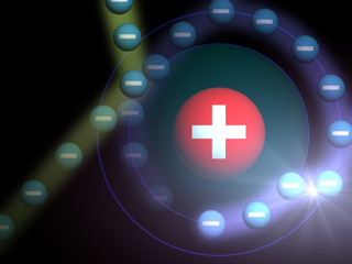 zugefügt wird. Der Atomkern wird von Elektronen umkreist, die